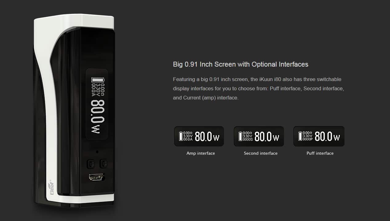 The Eleaf iKuun start kit compacts an i80 mod with MELO 4 tank. It features an innovative temperature protection system for charging that highly secures the safety of the charging process. It’s fit for a vape beginner.