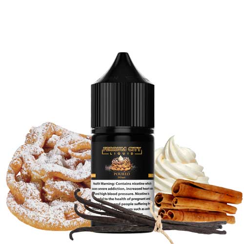 Poured Saltnic – Ferrum City. A sweet funnel cake topped with decadent vanilla whipped cream, and sprinkled with cinnamon, and sugar! In creating this flavor, we went to great lengths to capture the taste of funnel cake’s crispy brown exterior as well as its light, airy interior!