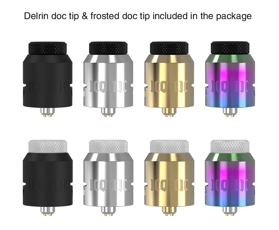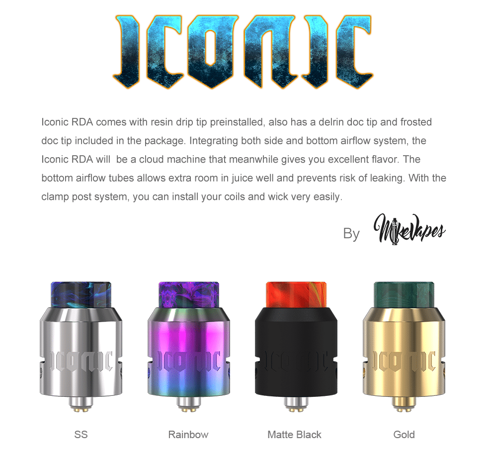 Iconic RDA Atomizer By Vandy Vape an updated version of the beloved Icon series RDA. Integrating the unique design from icon RDA, the Iconic RDA comes with a resin drip tip pre-installed, also has a Delrin doc tip and frosted doc tip included in the package. Integrating both side and bottom airflow systems, the Iconic RDA will be a cloud machine that meanwhile gives you excellent flavor. The bottom airflow tubes allow extra room in the E-juice well and prevent the risk of leaking. With the clamp post system, you can install your coils and wick very easily. Therefore, you should use one.