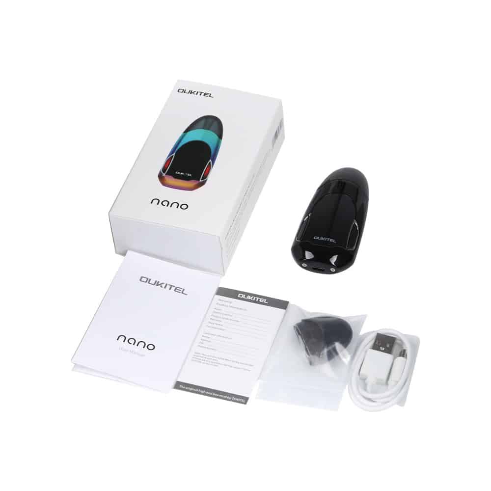 - 1 x Oukitel Nano Battery, 1 x Oukitel Nano Cartridge, 1 x Micro USB Charging Cable, 1 x User Manual.