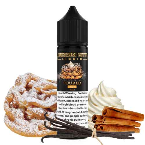 Poured – Ferrum City. A sweet funnel cake topped with decadent vanilla whipped cream, and sprinkled with cinnamon, and sugar! In creating this flavor, we went to great lengths to capture the taste of funnel cake’s crispy brown exterior as well as its light, airy interior!