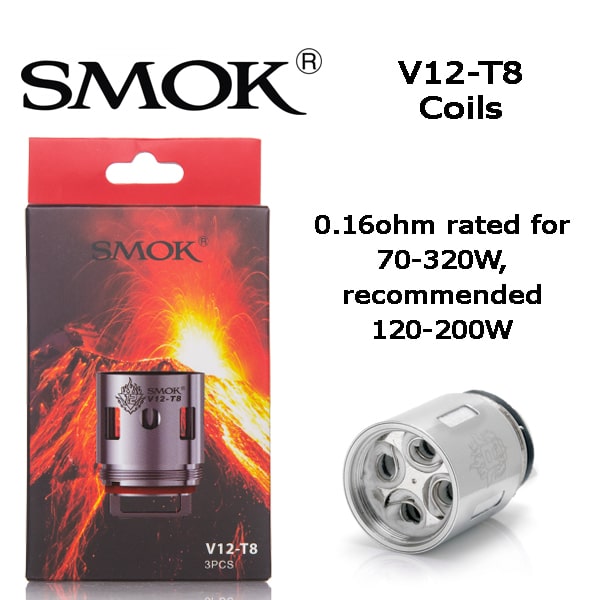 SMOK TFV12 V12-T8 Replacement Coil. V12-T8 coils designed for TFV12 atomizers with high performance. It will bring you a smooth taste. 6 different resistance values for your selection.  V12-T8 is a 0.16ohm octuple coil.  Just get them for your TFV12 tank to enjoy amazing vaping with massive clouds and the best flavor.